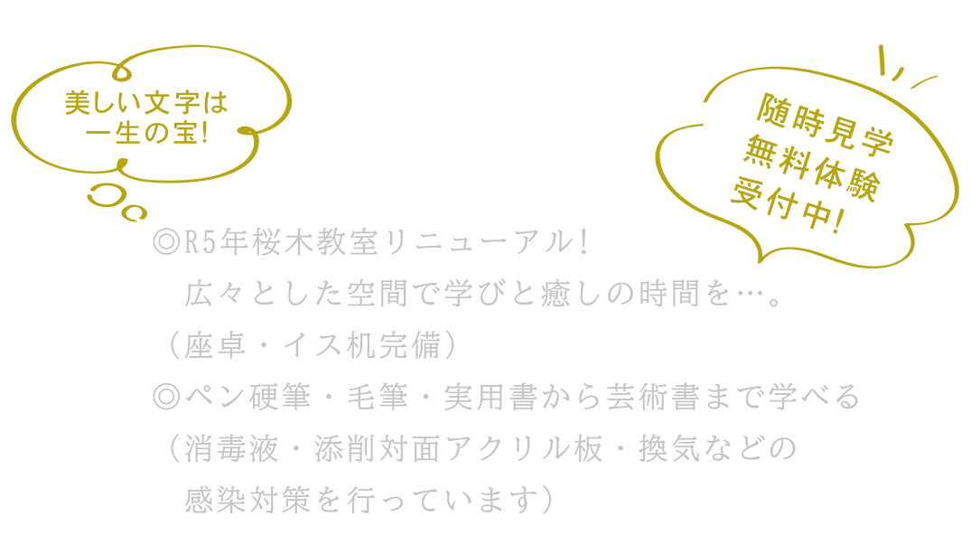 昔から「よみ・書き・そろばん」と言われてきた様に、習字・書道はすべての学習を支える基礎でした。私達は成長期に繰り返し字を書いて覚えることで、大人になってからも日常の文字を使いこなしてきたのです。今、スマホなどで使う文字を選択できるのも、習字・かきとり等で、その頃身につけた土台の力によるところが大きいと思います。